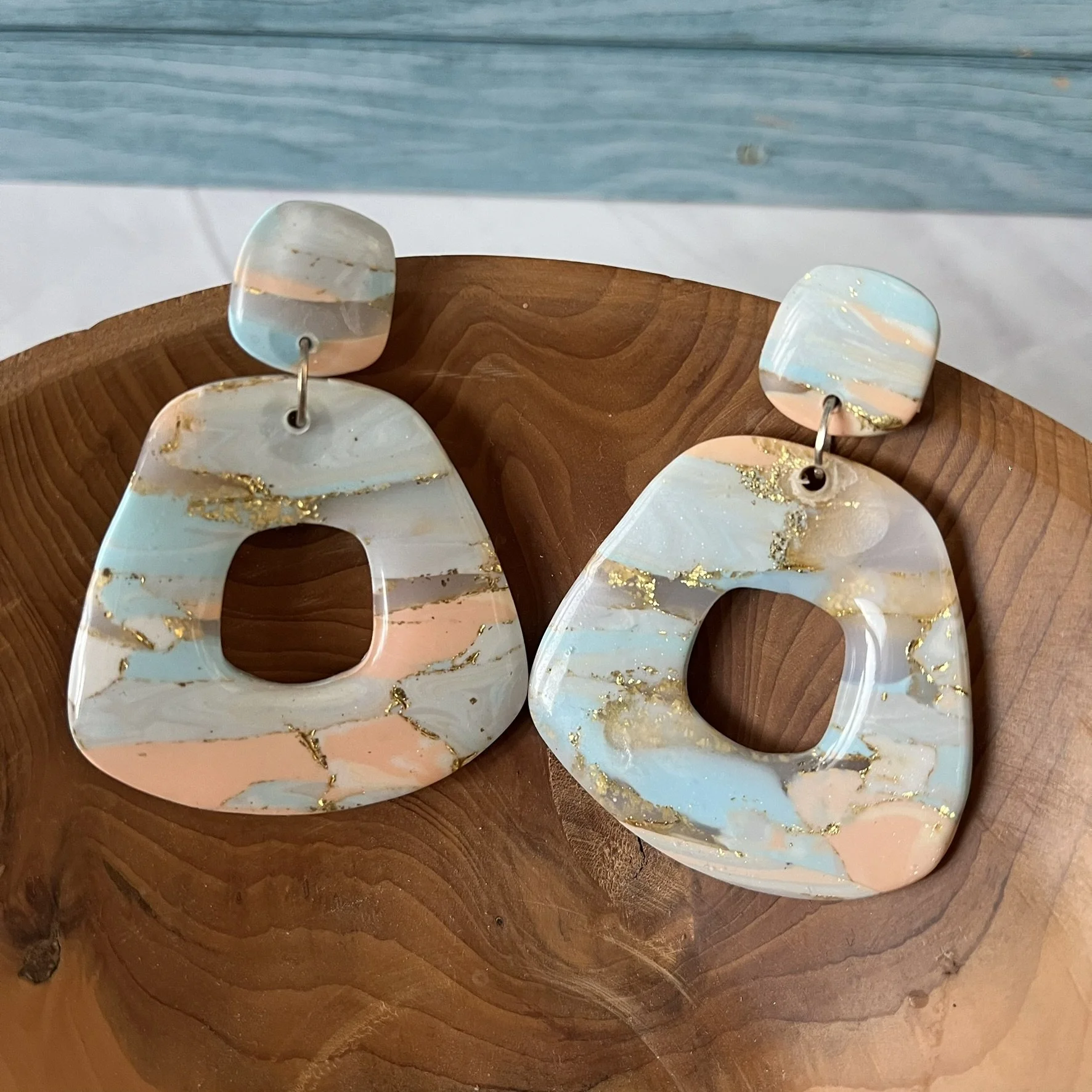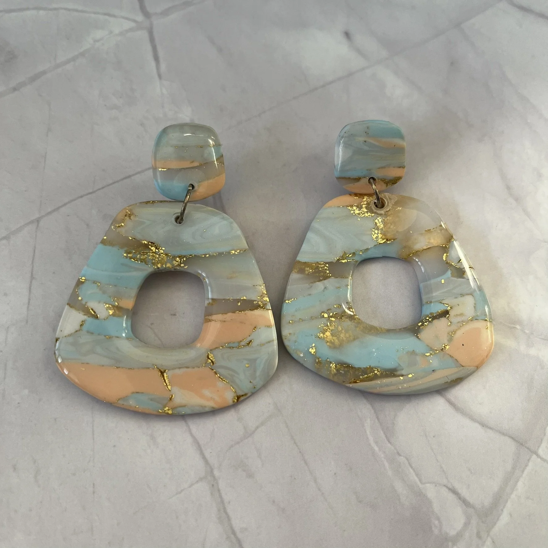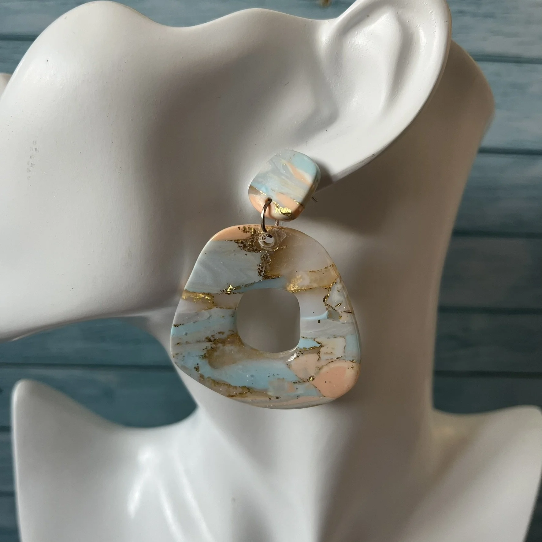Half moon shaped earrings made with navy, bronze, white and turquoise polymer clay with accents of gold leaf. Put together with brass charms and a black sparkle stud. 3 designs to choose from.